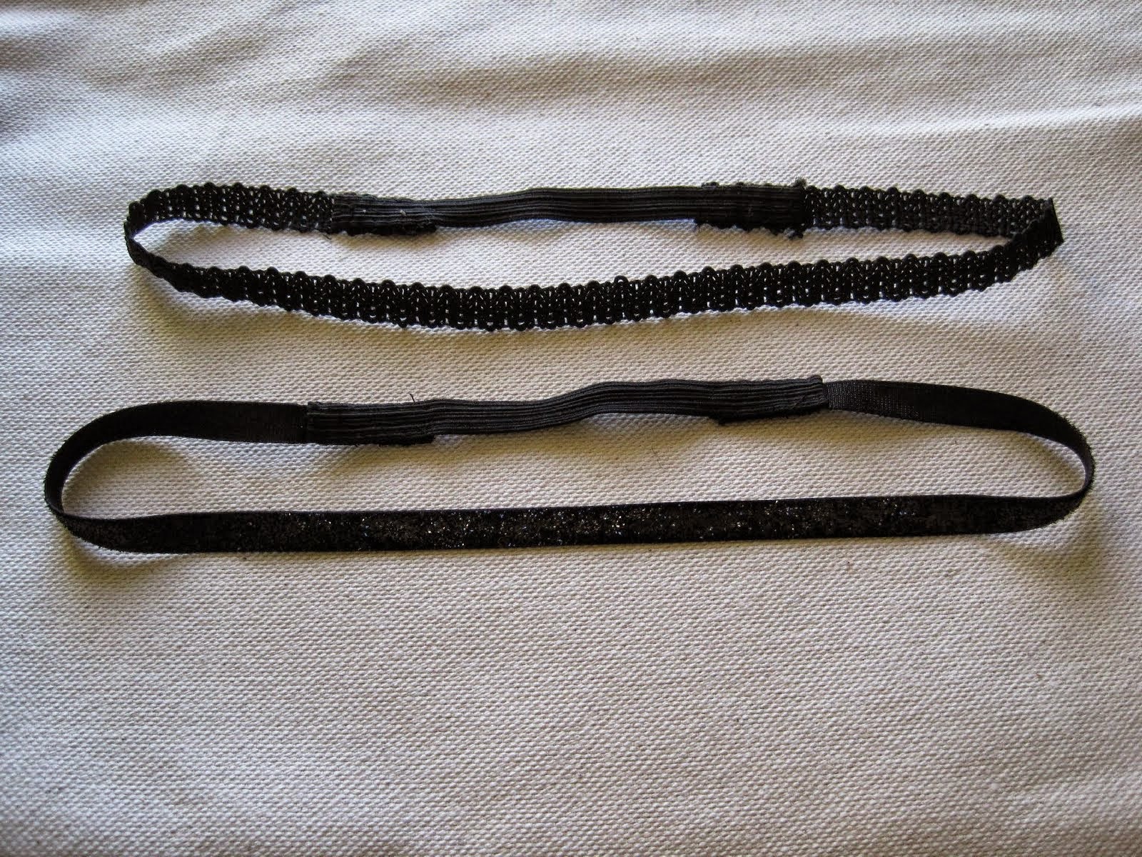 Here are two more headbands I sewed. The one is made from a sparkly ribbon and the other is made from a piece of braid. You should be able to see in the picture how I stitched the elastic at the lower end of the headband. You could machine sew them but I hand stitched these.