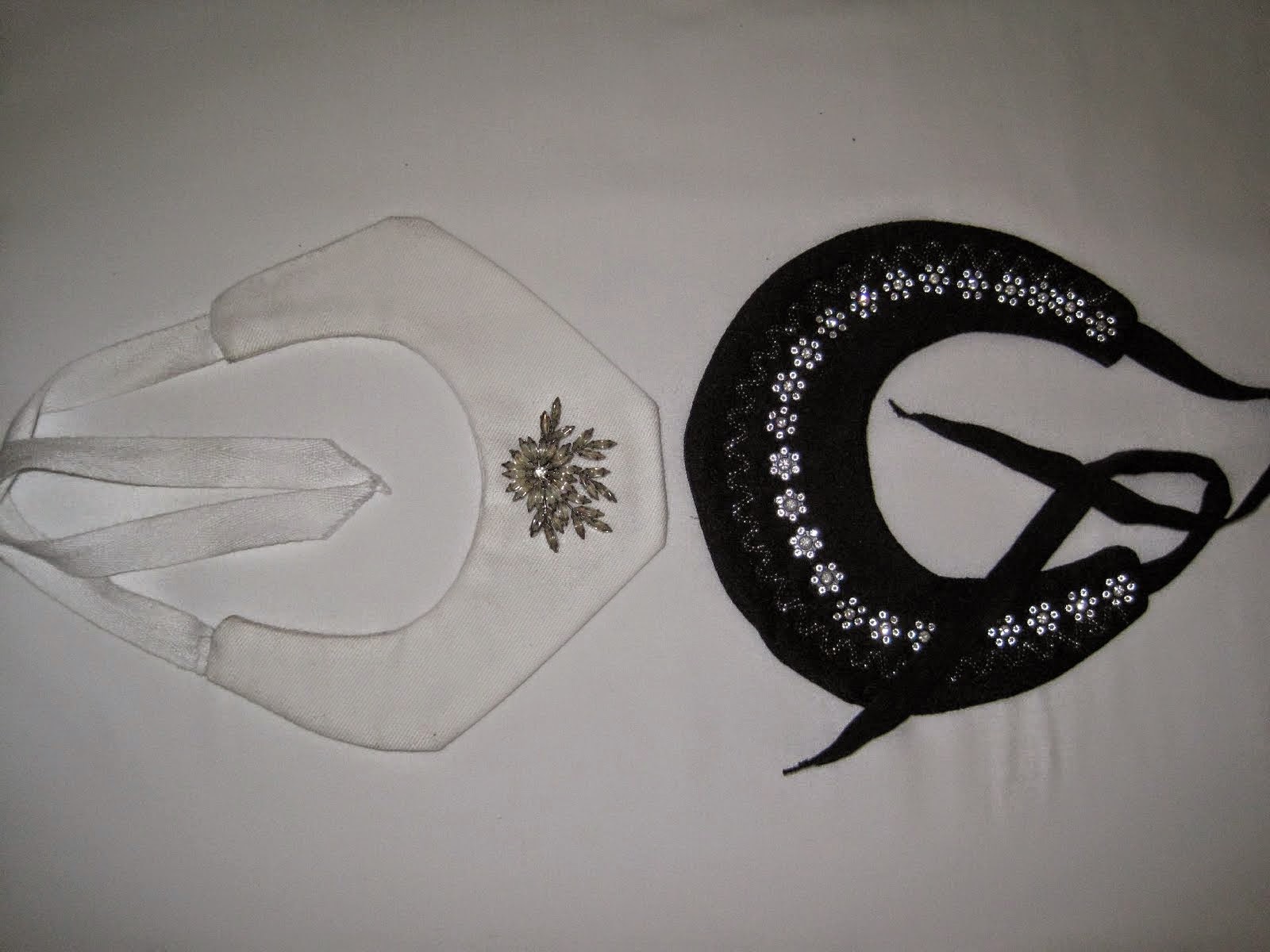 The white bib necklace has a vintage brooch and I stitched different pieces of sparkly trim onto the black bib necklace.
