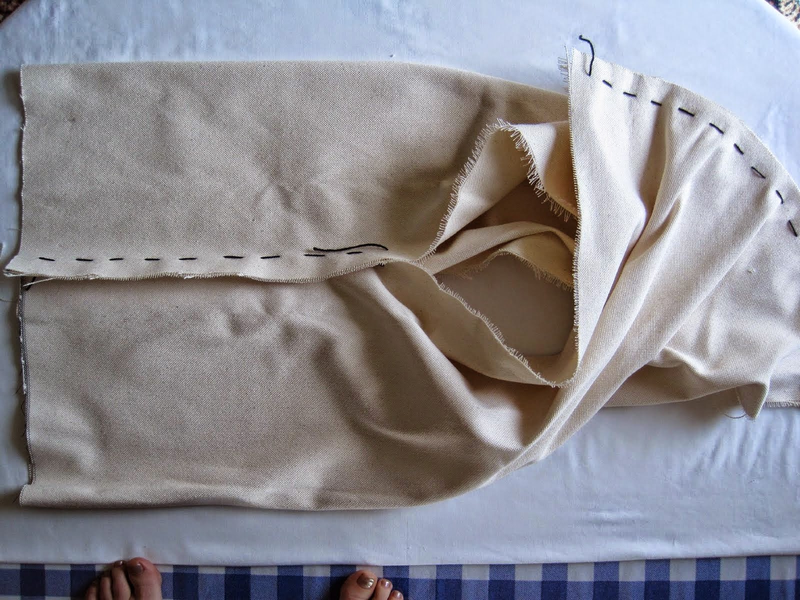 Here are the instructions for yesterday’s sling bag. It consists of two rectangles of firm fabric about 80centimetres by 40centimetres. I have hand stitched in big black stitches in the picture to show how it is put together.