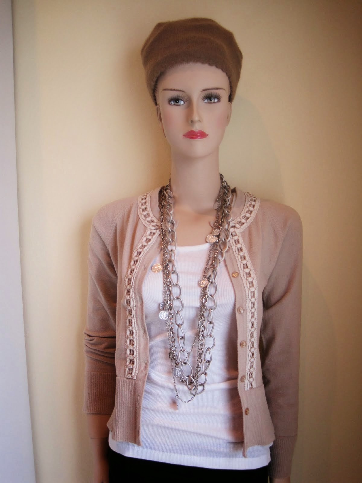 The necklace is a selection of long chains. You may recognise the coin chain from a previous post in amongst the neck chains. The whole look is very Coco Chanel.
