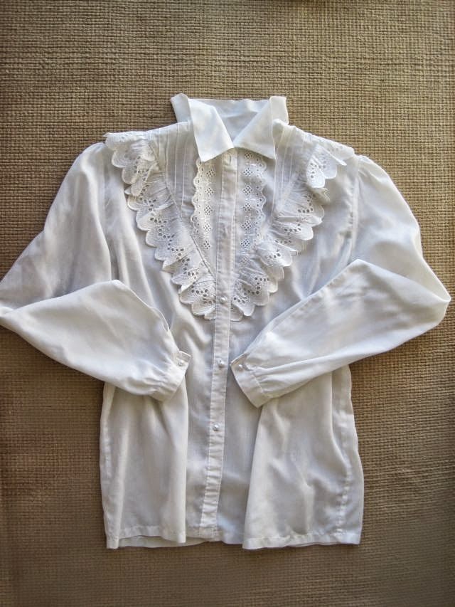 In the meantime here is a one more post with a picture I took before I left home. The shirt in the picture is vintage. What I was trying to convey is that it is possible to add a row or two of lace or anglaise to a shirt giving it a ruffled feminine look that is so current right now.