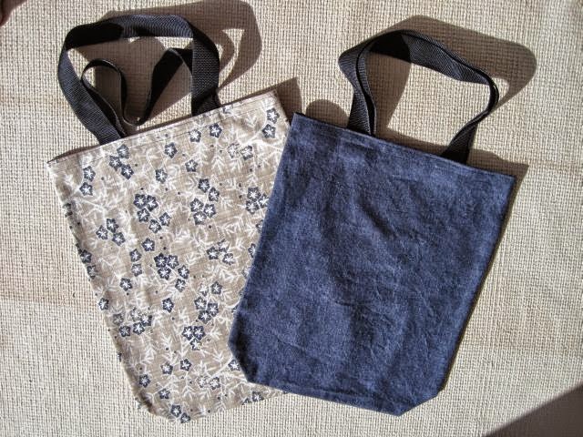 I managed to dredge up another project I did before I left home. In the picture are some easy tote bags I made.