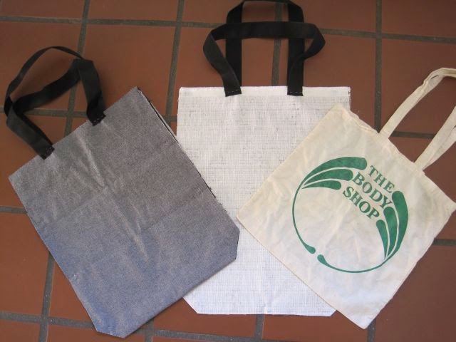 Here is a picture of the tote bags from the last post – in the making. I still have one of the original Body Shop cloth bags which I bought nearly two deacdes ago on the right. In the UK right now designer shopping bags are everywhere now and being used in lieu of handbags.