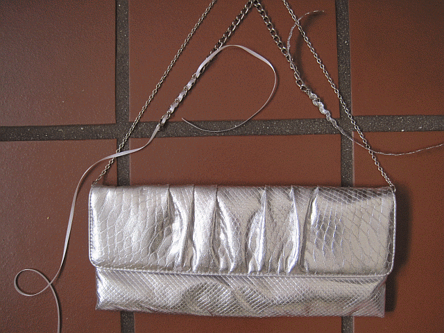 In the photo is a bag about to get it’s upgrade. I removed the original fine chain and was experimenting with ribbon on the left and silver rick-rack on the right. In the end I chose the ribbon for the new handbag chain. Adding a chain is an easy way to turn a clutch bag into one with a shoulder strap.