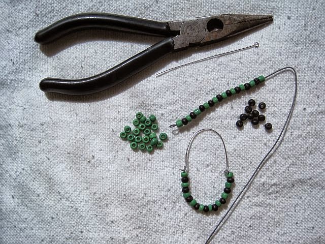 Basically the earrings are two pieces of wire with a loop at each end. The eye pin is silver and softer so I used that to fit through my ear. The other piece was heavier and the beads went onto that piece. You bend the wire into two matching half circle almost half oval shapes.