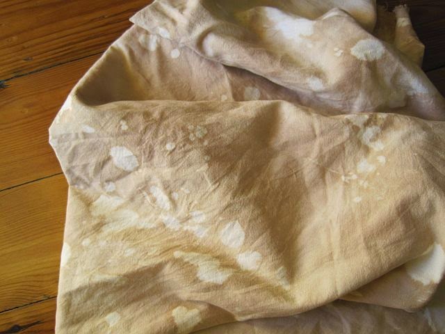 I took the fabric out and let it dry before I removed the rubber bands. The rubber bands weren’t tied tightly enough and the tea was a bit more even coloured that I hoped. So I took a dropper and sprinkled bleach or Javel water over the scarf to get the light coloured patches.