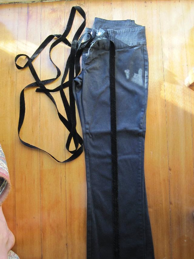 In the picture is some of the velvet ribbon about to be sewn to the trousers to turn them into Tuxedo style trousers. You could also stitch the ribbon along the outer side seam for a more authentic Tuxedo trousers look.