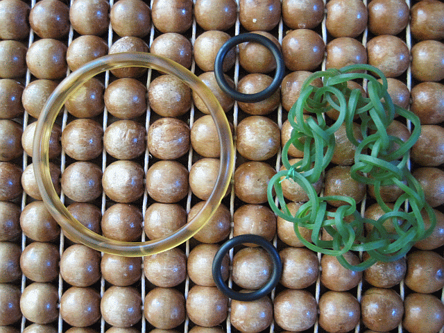 The black O-rings are standard hardware shop stock. They come in assorted sizes and can be worn as rings or bracelets. The skater kids wear armfuls of them. They come in different colours in the surfer shops. I think they call them jelly bangles.