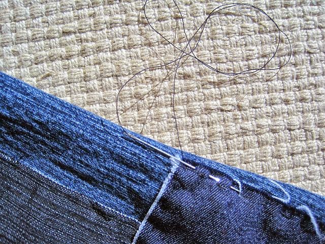 | Sew patches to jeans using small stitches |