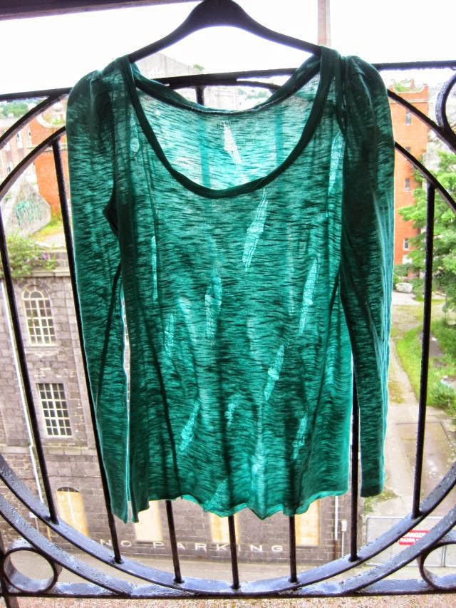 Then you have to pull and stretch the fabric so the loose stitches start to run. Much like getting a hole in your pantyhose. I used a pin to pick at it and keep it going. It takes a while but it looks lovely in this lightweight T-Shirt. I plan to wear a contrasting colour tank top underneath the shredded tee so the coloured tank top peeks through the shreds.