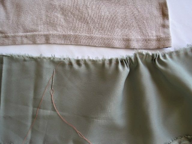 Pull the contrasting colour thread so the peplum/ruffle gathers up to fit the top.